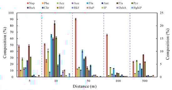 Distribution pattern of PAHs in soils around the coal spoil piles (Nap composition is shown in the left Y-axis, other PAHs composition is shown in the right Y-axis).