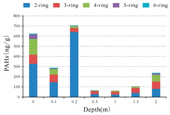 Along the vertical profile of borehole B2, the highest total PAHs concentration was observed in the soil sample with a depth of 0.5 m (Figure 6). Among the 16-U.S. EPA PAHs, IP, DahA, and BghiP were not detected in all the soils from borehole B2 (except for BghiP in B2-1). For light-PAHs (all of the 2-ring, 3-ring, and part of the 4-ring PAHs: Fla and Pyr), the highest concentration was found in the soils collected with a depth of 0.5 m (B2-4). For the rest 4-ring, 5-ring, and 6-ring PAHs (heavy PAHs), the highest concentration was observed in the surface soils (B2-1). Located in the downstream of the coal spoil piles, the soils from borehole B2 are frequently rinsed by the outlet from coal spoil banks. The elevated concentration in light PAHs in soils B2-4 (0.5 m) further confirms the downward movement and retardation of heavy PAHs in the underground system. Due to the precipitation recharge, soil in this depth is rinsed frequently. Based on the difference of adsorption ability of light and heavy PAHs in soil [,], the light PAHs are easier to move downward than the heavy PAHs. Therefore, the heavy PAHs are left and enriched in the soil. The difference of movement ability of individual PAHs is further proved by the test results of the leachate sample collected in the field (Table 2, Figure 3). The highest concentration of PAHs found in the leachate was Nap (20.06 ng/L), followed by Phe (4.76 ng/L), Ant (4.48 ng/L), Flu (3.94 ng/L), Acy (3.49 ng/L), and Ace (2.29 ng/L). This also informs us that the water is not the major medium for top soil PAHs pollution. Therefore, coal spoils constitute the major and even the only source of PAHs pollution in the coal spoil depositing area, and the study on the spontaneous combustion of coal spoils is necessary for better understanding the release way of PAHs.