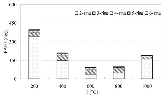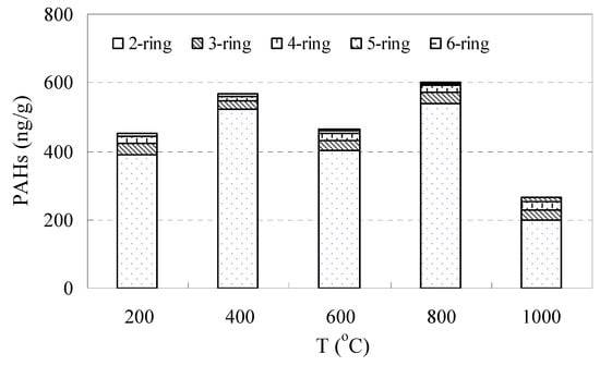 The burning test produced a lower content of PAHs (Figure 8). The total PAHs released was 996.6 ± 30 ng/g. This release content was about half of that in the heating test. The highest production of PAHs was 399.0 ± 21 ng/g at 200 °C, while the lowest was 95.84 ± 9 ng/g at 600 °C. The PAHs release at a low temperature (200 °C and 400 °C) accounted for about 60% of the total in the burning test. This means that the release of PAHs at a low temperature is still remarkable. High temperature (from 800 °C to 1000 °C) burning can increase the production of PAHs [,]. The production of PAHs is an endothermic reaction. Elevated temperature may help the break, synthesis, and cyclization of the pyrolysis product which produces PAHs. The PAHs released mostly belong to low-ring PAHs, with 2-ring of 74.1%, 3-ring of 15.6%, 4-ring of 7.75%, 5-ring of 1.8% and 6-ring of 0.75%. Among the PAHs released, the highest individual was Nap, ranging between 36.06 and 343.5 ng/g with an average value of 146.9 ng/g. The second highest was Phe, with a range of 2.93 and 8.32 ng/g. The lowest individual PAHs released was DaA, which was lower than the detection limit in all tests.