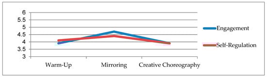 Our intervention suggested that Creatively Able, a physically active intervention, may be beneficial for self-regulation for children with ASD, a finding that is consistent with the literature for typically developing children [51]. The majority of studies examining the effects of PA interventions on executive function or other cognitive outcomes have focused on the effectiveness of aerobic exercises with or without additional cognitive challenges, without elucidating on the qualitative characteristics of their program or the contextual factors related to the program [19]. An important characteristic of our intervention is that it combined music with rhythmic movement patterns, as well as promoted working with partners through social activities, such as the mirroring activity. The use of music and positive social interactions as integral characteristics of PA programs have been found to be associated with positive affect and enjoyment in children [52] and have been identified as key constructs when planning or promoting quality PA sessions in youth [53]. Deriving satisfaction from a PA program and experiencing positive affect has been proposed to be associated with higher levels of engagement and self-regulatory skills [20,54,55].