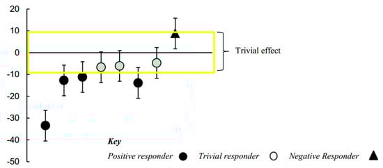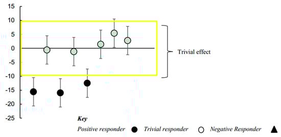 2. To individual responders, we: (i) Adjusted the individual change scores for each child to remove the artefactual effects of regression toward the mean; and (ii) expressed the uncertainty in each child’s change score as 95% confidence limits by multiplying by the appropriate critical value (1.96) from the t distribution. The artefactual effects of regression towards the mean were removed from each child’s change scores by: (i) Mean centering baseline scores; (ii) multiplying these values for baseline by a slope representing the effect of baseline derived from statistical first principles (i.e., by , where the denominator SD is the between-baseline SD for subjects in the control group; and (iii) adding this final effect to the child’s original change score [45,46,49]. This process results in a value for each child’s change score that is free of any contribution arising from regression towards the mean. These adjusted change scores can be illustrated on a scatter-plot with 95% confidence limits and with a highlighted area indicating trivial effects to show the proportion of positive-, negative-, and non-responders.