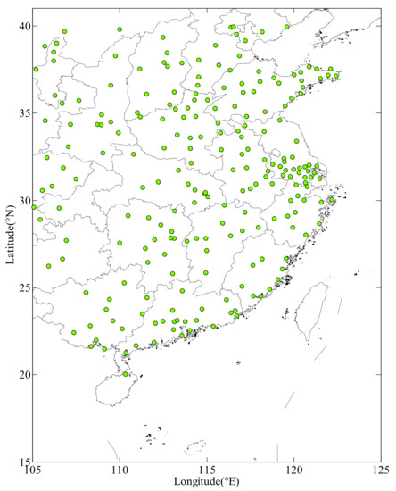 The monitoring data are from the China National Environmental Monitoring Center. The purpose of observation is to investigate the temporal/spatial distribution and variation of PM2.5, PM10 and various air pollution factors in China, to assess and evaluate the current situation and the variation trend of the atmospheric environment and to diagnose the air pollution problems. Daily averaged urban air quality observation data are provided by the China National Environmental Monitoring Center. There are more than 1400 stations monitoring the air quality of urban areas. Monitoring stations are well distributed in the districts of 337 cities. The PM2.5 concentration of a city is obtained by averaging the data from monitoring stations within that city. The number of cities located in the study zone is 225. Data of those 225 cities are used in this study. The observation period is a year (from January to December 2017). Data from 27 December 2017, 17 November 2017 and 3 October 2017 are analyzed in practical experiments. The distribution of the monitored cities is shown in Figure 1.