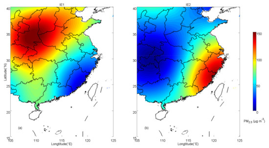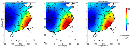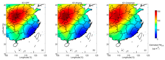 Fine particles (PM2.5) are particulate matters suspended in the air with diameters within 2.5 μm. PM2.5 is usually reported as a principal pollutant of air contamination. Exposure to highly concentrated PM2.5 affects the respiratory and cardiovascular systems and might cause heart and lung disease [1,2]. Moreover, PM2.5 is thought to be involved in some processes of neurodegeneration [3]. It was estimated that the global premature mortality rate associated with PM2.5 was at 3.15 million per year in 2010, with China being the leading country at about 1.33 million [4]. PM2.5 in 2015 contributed as much as 40.3% to total stroke deaths, 26.8% to ischemic heart disease deaths and 23.9% to lung cancer deaths [5]. The threat of PM2.5 pollution on public health has become increasingly remarkable. Therefore, there has been continued interest in computing and predicting the concentrations of PM2.5 and its effects on human health [6,7]. Spatial variation of pollutant concentration fields should be taken into account when computing air pollutant concentrations [8,9]. Estimations of accurate spatial variations in PM2.5 concentrations will provide valuable information for health risks and air quality control programs. Sufficient and accurate pollutant data are required to analyze and control air contamination problems. However, the observations of PM2.5 concentration are limited. Observational data can only be obtained from monitoring stations which are distributed sparsely in space [10,11]. In fact, comparatively accurate and sufficient PM2.5 data can be estimated with the help of interpolation for use in air pollution investigations and its effects on health.