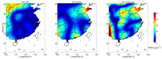 Spatial distributions of absolute errors of PM2.5 in IE1 with (a) OPF, (b) kriging and (c) Cressman methods.