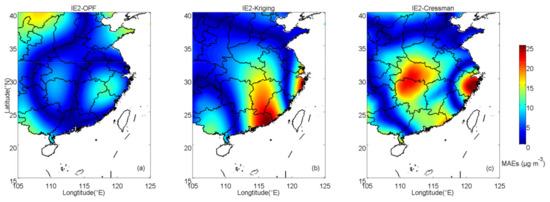 In IE1, the interpolation results estimated by OPF, kriging and Cressman methods are shown in Figure 3. Spatial distributions of absolute errors of PM2.5 in IE1 are shown in Figure 4. For the OPF method, large deviations (>15 μg·m−3) only appear in the northwest region and there is no region with errors larger than 20 μg·m−3. For kriging interpolation, large deviations are mainly concentrated in Shandong peninsula, which is located in the northeast of the study zone. For Cressman interpolation, errors in Shandong peninsula as well as the southwest region of the study zone are relatively large. The mean absolute error (MAE) between estimated results and prescribed values at sampling points is often used as a precision indicator for interpolation methods [27]. The spatially averaged MAEs of OPF, kriging and Cressman interpolation results are 4.89, 5.91 and 7.87 μg·m−3, respectively. This suggests that the OPF method produces a better result than the kriging and Cressman interpolations, which estimates the PM2.5 concentrations in IE1 to be closest to the prescribed field.