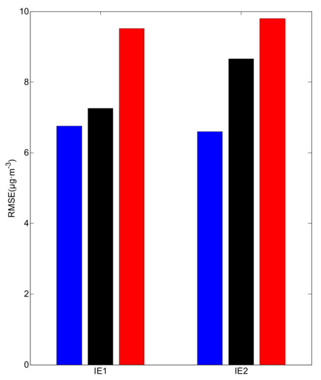 The RMSEs of the idealized twin experiments are shown in Figure 8. With the OPF method, the RMSE in IE1 is slightly larger than that of IE2, owing to the existence of larger errors (>15 μg·m−3 in MAE). With kriging or Cressman interpolation, the RMSEs in both idealized experiments are larger than those with the OPF method, indicating the accuracy of OPF, which agrees well with the result of the MAE analysis. The results of the idealized twin experiments reveal that the OPF method reconstructs PM2.5 distributions closer to the prescribed field than kriging or Cressman interpolation. This suggests that the estimation will apparently be more accurate if the OPF method is adopted.