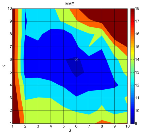 The mean absolute error (MAE) variation (μg·m−3) with orders in practical experiment 1 (PE1) (the marker represents the minimum MAE when s and k are both 6).