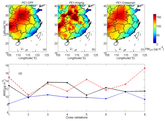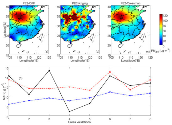 PE1 is continued with fitting orders (s and k) both set to be 6 with the aim of producing relatively accurate results. The averaged MAE is 9.48 μg·m−3 (close to that in CV5) of the OPF method. Figure 10a demonstrates the OPF estimations of PM2.5 concentrations in CV5. The averaged MAE of kriging interpolation is 11.60 μg·m−3, which is close to that in CV6. For Cressman interpolation, the averaged MAE is 13.02 μg·m−3, close to that in CV4. Figure 10b,c represent interpolation results computed by kriging and Cressman interpolations, respectively. The estimation with the OPF method presents lower errors than those with kriging and Cressman interpolations in PE1. Averaged MAEs of all the cross-validations estimated by those three methods are shown in Figure 10d. The results estimated by the OPF method are more accurate than those estimated by kriging interpolation in most of the cross-validation processes except for CV2, in which the difference between those two methods is relatively small. The MAEs of Cressman interpolation are always larger than those of OPF in all the eight cross-validation processes. The results of those methods show similar spatial patterns, yet differences also exist. PM2.5 concentrations calculated by Cressman interpolation lose the capability of estimating detail of distributions. The kriging interpolation presents an unsmooth pattern with a larger MAE than the OPF method.