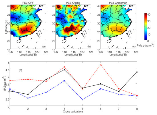 PM2.5 concentrations of PE1 calculated by (a) OPF, (b) kriging, (c) Cressman methods and (d) averaged MAEs for the corresponding methods (OPF method: blue dashed line, kriging interpolation: black solid line and Cressman interpolation: red dash-dot line).