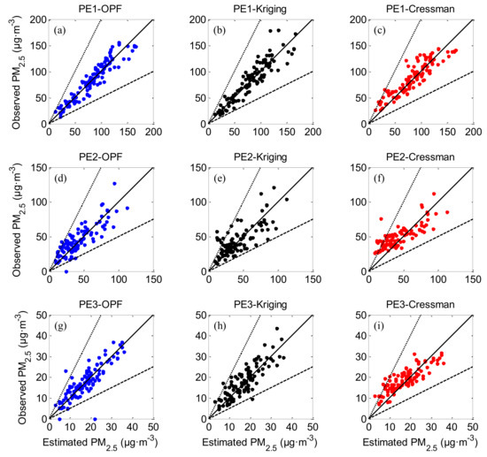 Figure 13 shows the comparison of estimated and observed PM2.5 concentrations for PE1, PE2 and PE3. The dotted, solid and dashed lines indicate the ratio of observed concentrations to estimated values equal to 2, 1, and ½, respectively. The results of the OPF method suggest that the estimated concentrations of PM2.5 agree well with the observations, with values concentrating near the solid line (the line indicating observations equal to estimations). Meanwhile, the interpolated results of kriging and Cressman methods are dispersedly distributed around that solid line, which involves relatively large deviations between the observed and estimated values.