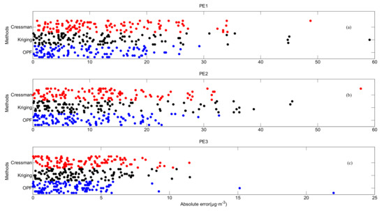 Absolute errors of cities in data set A for (a) PE1, (b) PE2 and (c) PE3 (OPF method: blue dots, kriging interpolation: black dots and Cressman interpolation: red dots).