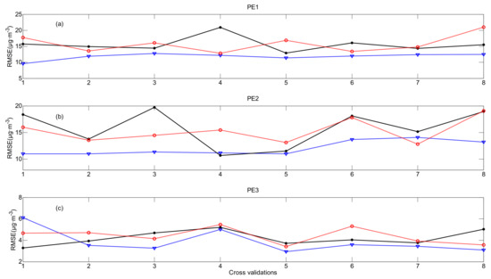 RMSEs in (a) PE1, (b) PE2 and (c) PE3 (OPF method: blue dashed line, kriging interpolation: black solid line and Cressman interpolation: red dash-dot line).