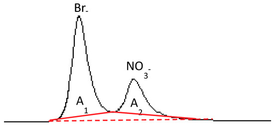 In order to find the expression of f and g, we used a procedure similar to the usual calibration performed to quantify a single species. Different standard solutions containing both nitrate and bromide ions in various proportions and at nominal concentrations ranging from 0.1 to 2 mM were prepared and analyzed by means of ion chromatography, using 1–3.2 mM and 1–8 mM NaHCO3-Na2CO3 eluents. The obtained chromatographic peaks were integrated as shown in Figure 1 and Meas.[Br−] and Meas.[NO3−] values were obtained for each solution. Being the nominal amount of bromide (Nom.[Br−]) and nitrate (Nom.[NO3−]) known, it is possible to calculate E[Br−] and E[NO3−] for each solution according to Equations (1) and (2).