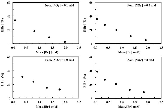 Variations of Meas.[NO3−] did not virtually produce changes in E[Br−]. On the other hand, higher Nom.[Br−] values produced lower errors in evaluating bromide concentration. In particular E[Br−] ranges from ca. 40 to less than 10% for Nom.[Br−] values ranging from 0.1 to 2 mM, as also observed in Figure 2.