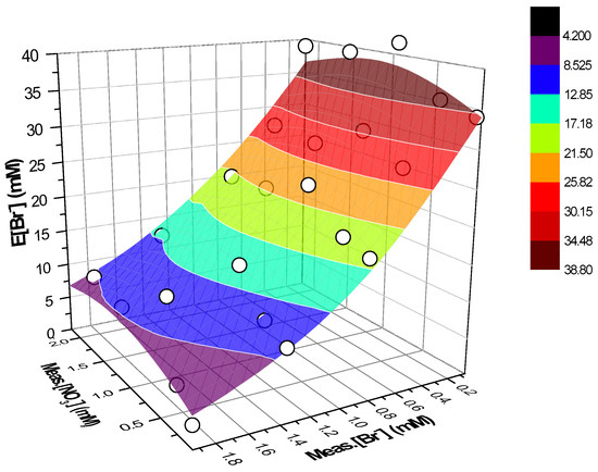 Plotting the experimental values in a 3D space with the x, y, and z axes being Meas.[NO3−], Meas.[Br−], and E[NO3−], respectively, affords points which may be non-linearly fitted by means of Origin 8.5 platform. In this case, a polynomial function in the form expressed by Equation (5) may also be one of the best options. Considerations similar to the case of E[Br−] can be made, so that the polynomial function with m = n = 2, expressed by Equation (7), can be chosen as the best compromise between a good fitting and a trend description ability.