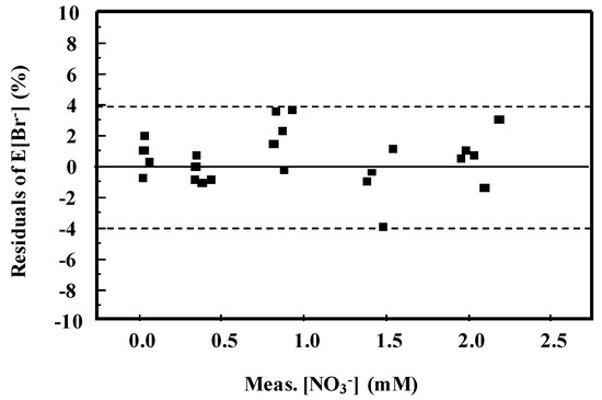 Residuals of E[Br−] (difference between experimental points and fitted values) vs. Meas.[NO3−].