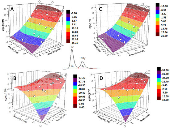 Figure 2 and Figure 3 clearly demonstrate the existence of a trend in the error generated by integrating peaks according to Figure 1. This trend may be mathematically expressed through Equation (3) by means of a nonlinear best fitting procedure in a 3D space where Meas.[NO3−], Meas.[Br−], and E[Br−] are reported as the x, y, and z axes, respectively. Among the possible fitting functions, polynomials in the form