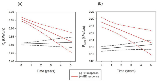 | ΔR5–20 (kPa/L/s/year) | 0.001 ± 0.001 | −0.001 ± 0.001 | 0.002 ± 0.001 | −0.012 ± 0.004 * |