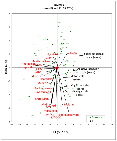 Certain OCPs were found to be able to predict the five domains of the Bayley-III scale using the MANCOVA test, as shown in Table 6. Breastmilk 4,4′-DDT, and endrin were negatively correlated with the cognitive scores after maternal age, pre-pregnant BMI, parity, and infant gender were adjusted. In the cognitive scale outcome, 4,4′-DDT significantly decreased the score to 7.43 (95% CI: −12.6–−2.29), and endrin decreased it to 14.2 (95% CI: −26.8–−1.56) with R2 = 0.328. Social–emotional outcomes had significantly inverse associations with Endrin (R2 = 0.16, β = −24.5, p = 0.041). Similarly, this association was also observed between the adaptive behavior outcome scale and heptachlor epoxide (R2 = 0.03, β = −31.4, p = 0.041), respectively. The motor scale (R2 = 0.255) was negatively and significantly linked to 4,4′-DDT (β = −6.13, p = 0.010) and heptachlor epoxide (β = −26.6, p = 0.001). However, OCPs such as heptachlor (β = 18.5, p = 0.010) and endosulfan I (β = 21.5, p = 0.015) were found to have significant positive associations with the motor and language scores. As compared to the RDA analysis, the MANCOVA test showed that higher heptachlor exposure was associated with better motor performance whereas higher endosulfan I exposure was correlated with better language score. All other breast milk OCPs showed consistent significant negative associations with the Bayley outcomes except for heptachlor and endosulfan I for the RDA and MANCOVA analyses.
