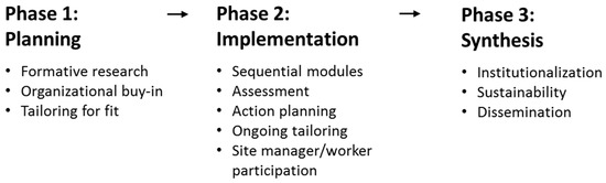 Previous research has confirmed the important contributions of the work organization to worker safety, health, and wellbeing [2,11,19,21,24,55]. We relied on four underlying essential elements in the organizational change process [56]. Through leadership commitment, the aim was to provide necessary resources and support, ensure accountability, and establish health, safety, and wellbeing as an organizational priority. Leadership commitment has been associated with improved outcomes related to job-related wellbeing [57,58], workplace injuries [59,60], and health behaviors [61,62]. Participation includes engaging stakeholders at every level of the organization, including district-level managers, site managers of specific worksites, and frontline workers. This combined approach of using both top-down and bottom-up approaches in the intervention development and implementation builds on assets and resources across multiple levels of the organization [33,63,64,65]. Communication provides a vehicle for building collaborative relationships across the organization, including fostering effective vertical and horizontal communications [33,66]. Tailoring for fit reflects the need to tailor the intervention to the organizational context [56]. Integrating interventions into existing structures and practices may minimize additional burdens arising from implementing new procedures and from changes in the ways work is organized, designed, and managed [56].