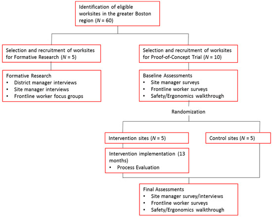 Two groups of managers were also included. Site managers were responsible for operations at each worksite. Site managers at the formative research worksites were interviewed as part of the planning process. For the PoC trial, site managers at all 10 PoC worksites participated in the site manager survey and were interviewed as part of the safety and ergonomics walkthrough. The five site managers at PoC intervention worksites were central to all phases of the intervention planning and implementation. District management included those with responsibilities across worksites at the district level, including representatives of human resources, health and safety, operations, and those with direct supervision of the participating worksite accounts. District managers were interviewed as part of the formative research, and for the intervention, contributed to planning and implementation of district-level policies and practices.