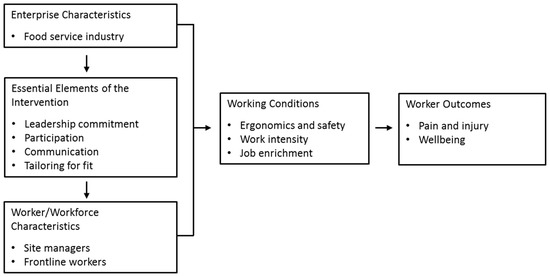 Maintaining this central focus on working conditions, in this study we operationalized the overall model to focus on this intervention and setting (Figure 3). The model illustrates the essential intervention elements, working conditions, and outcomes specifically targeted within this intervention. Through formative research, workers and managers identified core priorities for their safety, health, and wellbeing. Following the pathways in the conceptual model, we identified working conditions likely to influence these outcomes, and intervention elements essential to improving these working conditions.