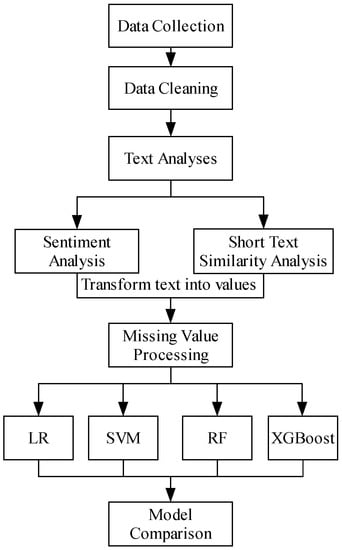 We originally introduce the results of text analysis of each individual as the prediction factors of our classification model. To convert the texts into measurable numerical variables, Baidu’s AipNLP was applied, which is regarded as the most advanced Chinese text analysis technique. The goal of sentiment analysis is to convert the text into a value between 0 and 1; the closer the value is to 1, the more positive the text sentiment, and the closer the value is to 0, the more negative the text sentiment. Similar to sentiment analysis, short text similarity analysis converts a text into a value between 0 and 1 given another matched text, and the higher the value, the more similar the two texts. To ensure precision, the data were cleaned using the following process: