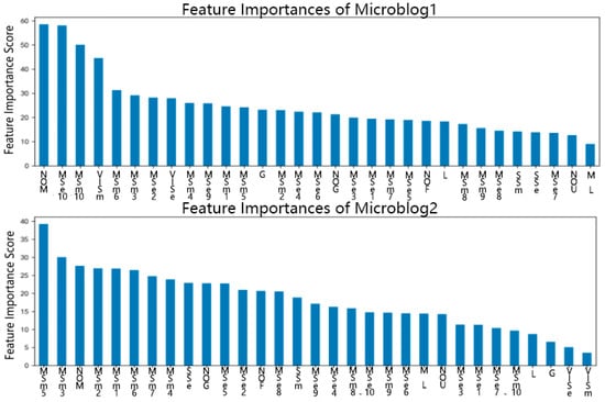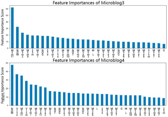 By applying XGBoost model, it is possible to identify the feature importance for the prediction, as shown as Figure 2. When XGBoost is constructing a tree, it needs to split to make sequential classifications, and the feature importance score is judging the information gain of different features. The more information gains a feature can provide, the more likely it would be selected by XGBoost as the basis of classification, and the higher of the feature importance score. Although the feature importance characteristics were different for the different microblogs, there were still some noticeable similarities. For instance, the ‘Number of Microblogs’ was always an important feature as it was a good measure of a user’s activity, while the Number of Users a user followed, Gender, Membership Level and Location were not as important as expected. On the contrary, the content of the users’ verified information, the signature or brief introduction and the 11 most recent posted microblogs (including the topping microblog if they had one) were found to play an important role in spreader prediction.