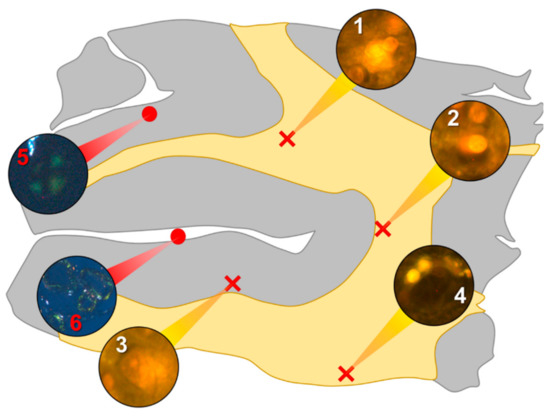 Schematic depicting a 5 μm tissue section of the parietal lobe. White matter and grey matter are highlighted yellow and grey, respectively. Lumogallion-reactive aluminium was identified through sequential scanning of a 5 μm tissue section, with positive bright orange fluorescence denoted by red crosses (regions 1–4). On an adjacent serial section, Congo red positive regions showing apple-green birefringence under polarised light identified amyloid and spherulites, denoted by red circles (regions 5 and 6).