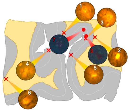 Schematic depicting a 5 μm tissue section of the occipital lobe. White matter and grey matter are highlighted yellow and grey, respectively. Lumogallion-reactive aluminium was identified through sequential scanning of a 5 μm tissue section, with positive bright orange fluorescence denoted by red crosses (regions 1–6). On an adjacent serial section, Congo red positive regions showing apple-green birefringence under polarised light identified amyloid and spherulites, denoted by red circles (regions 7 and 8).