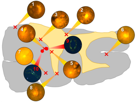 Schematic depicting a 5 μm tissue section of the temporal lobe. White matter and grey matter are highlighted yellow and grey, respectively. Lumogallion-reactive aluminium was identified through sequential scanning of a 5 μm tissue section with positive bright orange fluorescence denoted by red crosses (regions 1–8). On an adjacent serial section, Congo red positive regions showing apple-green birefringence under polarised light identified amyloid, denoted by red circles (regions 9 and 10).