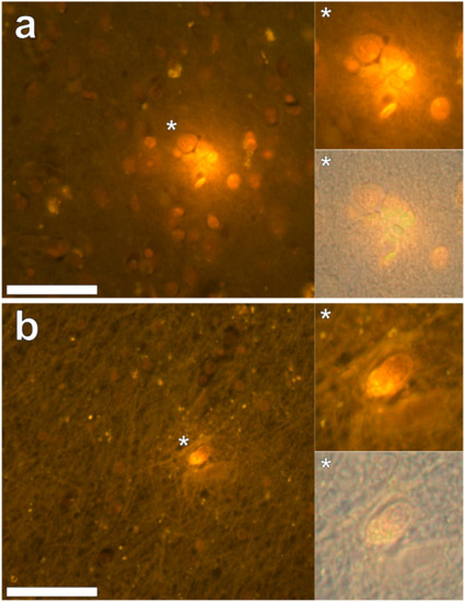 Intracellular lumogallion-reactive aluminium identified in grey and white matter regions of the temporal lobe. Glial cells exhibiting astrocytic-like processes displayed bright orange fluorescence in grey (a) and white (b) matter regions. Magnified inserts are denoted by asterisks with lower panels including a bright field overlay. Magnification 400×; scale bars 50 μm.
