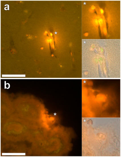 Lumogallion-reactive aluminium in glial cells in white matter of the parietal lobe. Intracellular bright orange fluorescence was noted in glial cells surrounding vasculature (a) and in areas depicting cellular debris (b). Magnified inserts are denoted by asterisks with lower panels including a bright field overlay. Magnification 400×; scale bars 50 μm.