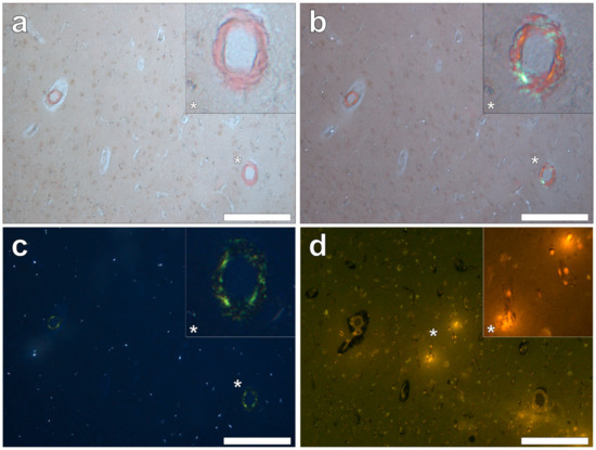 Congo red reactive amyloid deposited independently of lumogallion-reactive aluminium in the temporal lobe. Positive Congo red staining was observed under bright field (a), partial (b) and fully (c) polarised light, demonstrating an apple-green birefringence confirming the presence of amyloid with a β-pleated sheet conformation. Intracellular aluminium identified in glial-like cells (d) was not co-located with amyloid within the vasculature. Magnified inserts are denoted by asterisks. Magnification 100×; scale bars 200 μm.