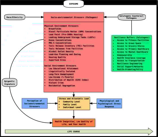 Socio-environmental stressors do not work independently and are often additive and/or multiplicative in nature; thereby creating cumulative impacts that may lead to adverse health outcomes over the life course. Exposures to environmental stressors modify aspects of gene expression in the epigenome that may cause individuals to deviate from a life course trajectory of optimal health []. Differentially burdened populations of color and economically marginalized groups are particularly vulnerable to epigenetic modifications since they often experience the greatest exposure to environmental hazards in their neighborhoods [,,,,] and may lack health-promoting infrastructure or resiliency buffers that are necessary to offset negative exposures. Without these safeguards in place, communities of color and low-income groups overburdened by EJ issues (i.e., heavily trafficked roadways, Toxic Release Inventory [TRI] facilities, crime) may be more likely to have higher mortality rates of stroke, hypertension, cancer, diabetes, and heart disease when compared to their White and more affluent counterparts [,].