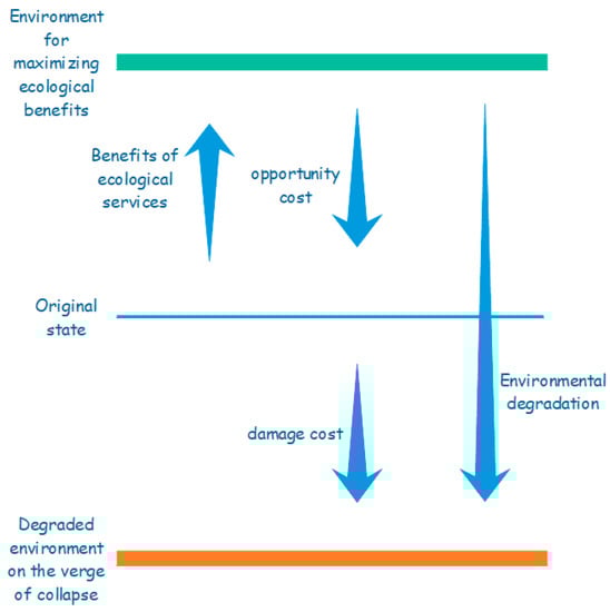 On the basis of the Equation (8), we further obtain the environmental degradation cost (CED). Figure 2 shows the concept of the environmental degradation cost, which is the sum of opportunity cost (Coppo) and damage cost (Closs). The formula is characterized as: