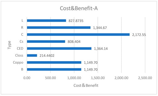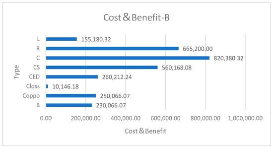 Considering the limited data of the full cost of a specific land use project, we simulate two different kinds of land use projects: Small-scale agricultural land A and large-scale industrial land B. We give the final results of ecological service benefit B and damage cost Closs based on Equations (6) and (8). The cost data of land use projects calculated by the modified Cobb–Douglas production function model are as in Table 5.