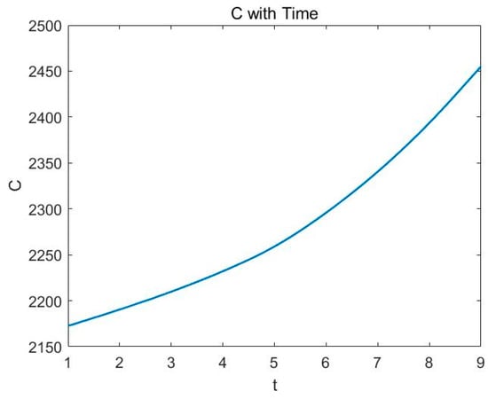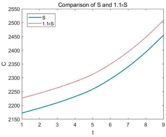 In the figures, the horizontal axis is time and the vertical axis is true economic cost. It can be seen clearly that the true economic cost C increases with the growth of S and Li. By calculating, we get the standard deviations of the two curves are 51.2502 and 55.5490, respectively. That is, when S changes by 10%, C changes by 2.36%, and when Li changes by 10%, C changes by 2.56%. Sensitivity analysis results show that the model does not depend on the two basic indicators of effective land area S and specific parameters Li of different ecological service functions, and the model performs well.