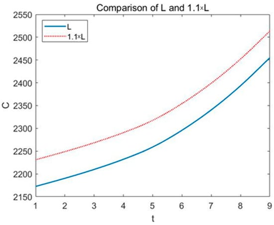 The model proposed in this paper involves several indicators, but most of the indicators are based on the effective area of land S and the specific index Li of different ecological service functions. Therefore, we added small disturbances to S and Li. We increased the original data to 1.1 times to see the changes on true economic cost of land use projects. The result is shown in the following figures (see Figure 8 and Figure 9).