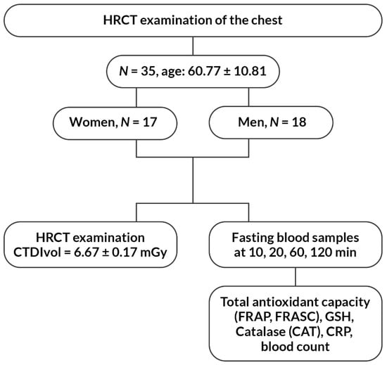 Fasting blood samples were collected from all 35 participants of the study in the morning directly prior to examination. The second blood collection took place 10 min after the examination, and other after 20, 60 and 120 min. In total, 10 mL of blood was collected from each patient from the ulnar vein puncture using a closed Sarstedt system (Sarstedt AG&Co., Numbrecht, Germany) containing K2EDTA as an anticoagulant. Plasma was separated from the blood cells by centrifugation at 400× g for 10 min at 4 °C. Plasma samples were stored at −80 °C until the analysis of the selected antioxidative markers: catalase (CAT), total antioxidant capacity of plasma expressed as FRAP and FRASC, and reduced glutathione (GSH). In addition, routine laboratory tests were performed from the obtained material (i.e., blood count and C-reactive protein (CRP) according to the applicable procedures in the hospital laboratory). The flow chart of the study is presented in Figure 1.