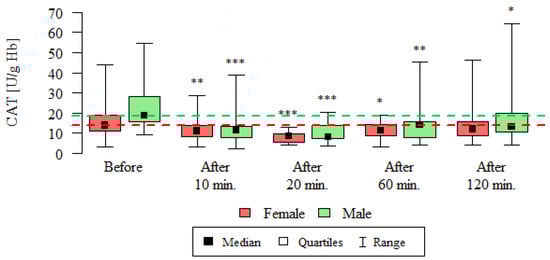 CAT activity [U/g Hb] in the blood of subjects undergoing routine HRCT examination before the test, 10 min, 20 min, 60 min and 120 min after the test. The analysis was carried out using the Wilcoxon test for dependent (repeated) measurements; the graph shows the medians, quartiles and ranges of values of individual variables. * p—comparison with the measurement before the examination (* p < 0.05, ** p < 0.01, *** p < 0.001)—Wilcoxon test for dependent (repeated) measurements.