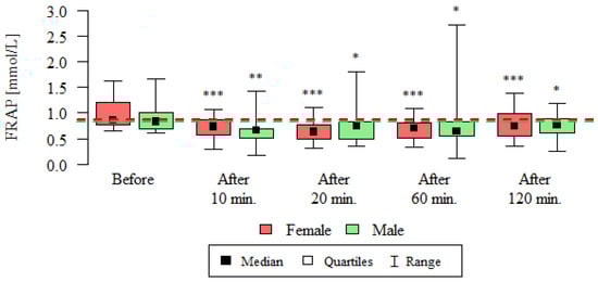 As the presented results show, the total antioxidant potential expressed as FRAP was statistically significantly lower after 10, 20, 60 and 120 min compared to its values before the test, both in women and men (Table 3, Figure 4).