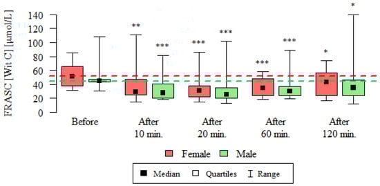 Total antioxidant capacity expressed as FRASC (vitamin C) [µmol/L] in the blood of subjects undergoing routine HRCT examination before the test, 10 min, 20 min, 60 min and 120 min after the test. The analysis was carried out using the Wilcoxon test for dependent (repeated) measurements; the graph shows the medians, quartiles and ranges of values of individual variables. * p—comparison with the measurement before the examination (* p < 0.05, ** p < 0.01, *** p < 0.001)—Wilcoxon test for dependent (repeated) measurements.