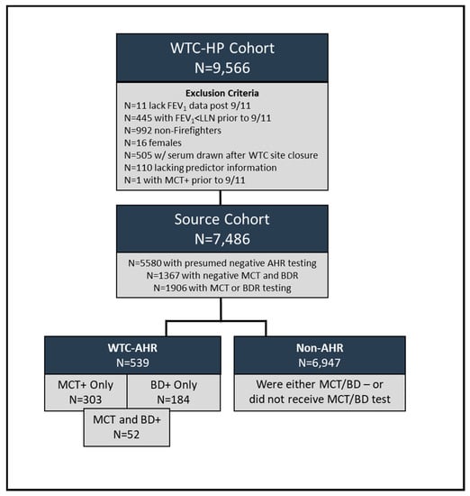 AHR Definition. The cohort was followed longitudinally until 1 August 2017 and N = 1906 had either a pulmonary function test (PFT) with assessment of bronchodilator response (BDR) or methacholine challenge test (MCT) administered. World Trade Center Airway Hyperreactivity (WTC-AHR) was defined at the earliest positive BDR or MCT after WTC exposure. In general, a bronchoprovocation test such as an MCT may be utilized to assess hyperreactivity, whereas a bronchodilator test may indicate reversibility consistent with asthma. MCTs were positive when the cumulative methacholine dose that reduced the FEV1 by 20%, (PC20) was equivalent or was less than 16 mg/mL [32]. BD was positive when post-bronchodilator FEV1 change exceeded 12% and at least 200 mL [33]. Those without AHR (N = 6947) were defined as those who either had a negative study or were presumed negative if they did not have subspecialty testing.