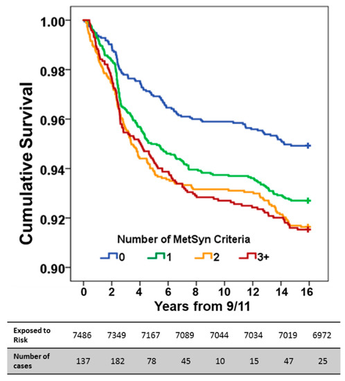 Statistical Analysis. SPSS-23 (IBM) was used for primary data handling and statistics. Continuous variables are expressed as mean (standard deviation (SD)), and compared by two-sample t-test. Categorical data was summarized as count and proportions, and compared using Pearson-χ2. Smoking data was categorized into a dichotomous variable of ever or never a smoker, as previously described [38,39,40,41,42]. The primary endpoint of all analyses was development of WTC-AHR based on a positive BDR or MCT any time after 9/11. Survival interval was determined by time from 9/11 to positive AHR test or until 1 August 2017, the administrative censoring date of the study closure, if they did not have AHR. Association of endpoints and MetSyn, smoking, BMI, and exposure level were analyzed using the Cox proportional hazards regression and are represented as hazard ratio (HR) and 95% confidence interval (CI). We assigned a cut point of ≥500 eosinophils/µL as a marker of clinically significant eosinophilia for Cox modeling. All models were adjusted for age at 9/11, exposure intensity, and smoking status, and considered significant if p < 0.05. Omnibus testing was used to assess the quality of the comparisons. Time-to-event curves were determined by the Kaplan–Meier method and compared with the log-rank test. There were no dropouts in this study.