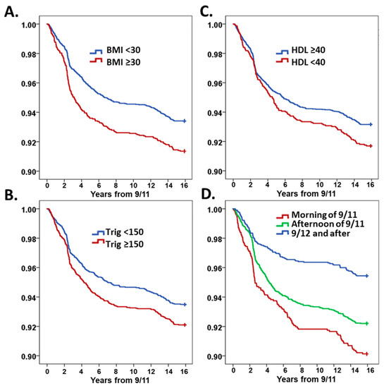 Kaplan–Meier survival curves stratified by (A). BMI ≥30 kg/m2 (p = 0.001 by log rank), (B). Triglycerides ≥150 mg/dL (p = 0.019), (C). HDL <40 mg/dL (p = 0.038), and (D). Exposure intensity (p < 0.001). Cumulative disease-free survival is expressed on the y-axis and time in years from their WTC exposure is on the x-axis. Log rank was not significant for SBP, DBP, and glucose, and were not included in this graph.