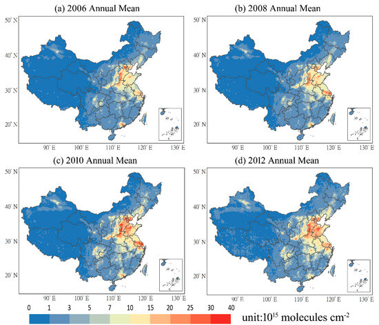 Spatial distribution of annual mean tropospheric NO2 over China in 2006, 2008, 2010 and 2012.