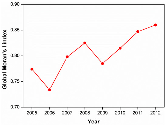 Global Moran’s I values at the city level from 2005 to 2012.