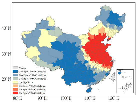 The statistically significant positive Gi* statistic indicates the clustering of high values (hot spot) and the statistically significant negative Gi* statistic indicates the clustering of low values (cold spot).