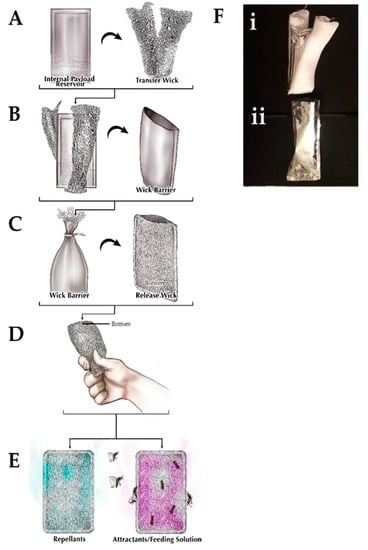 Controlled-release device. The (A) internal payload reservoir is surrounded by the transfer wick and they are placed together inside the (B) wick barrier. This wick barrier is placed inside the (C) release wick before being (D) utilized to (E) release either repellants or attractants/feeding solutions. (F) Actual images of the (i) internal reservoir and transfer wick that is inserted into the (ii) wick barrier.